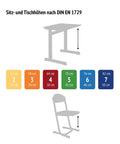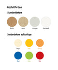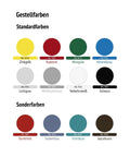 - Gestellfarben: Zinkgelb, Rubinrot, Himmelblau, Minzgrün, Lichtgrau, Tiefschwarz, Weißaluminium, Verkehrsweiß – Sonderfarben (einmaliger Aufpreis von 60€ / Netto): Karminrot, Taubenblau, Türkisblau, Sepiabraun