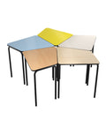 Ihr Unterrichtsraum in vielen Varianten. Der 5 Punkttisch kann in vielen verschiedenen Konfigurationen gestellt werden; Als Stern für 5 Schüler, oder im 2er, 3er oder 4er Gespann. Was den 5-Punkttisch dabei besonders macht, ist dass er die starren Strukturen der traditionellen Schülermöbel aufbricht und dem Klassenzimmer neuen Pep versetzt. Dennoch kann der Tisch auch in konventionelleren Stellweisen genutzt werden, sodass Frontalunterricht problemlos möglich ist. Auf Anfrage können auch weitere Farben für ABS-Kante und Gestell bereitgestellt werden.