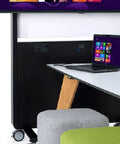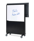Die Vorderseite bietet Platz für Displays bis zu 75 Zoll, während die Rückseite optional mit einer halbhohen Whiteboard-Oberfläche ausgestattet werden kann. Dieses ist ideal für agile Workflows und interaktive Zusammenarbeit.